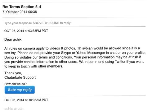 All Image October 7, 2014 CBRules Leave a comment UPDATE on Chaturbate Terms & Conditions 5. d. This is a further update for the Terms & Conditions section 5. d. from an email received from Support via Achix0815 on Twitter – Thank you. Share this: Click to share on X (Opens in new window) X Click to share on Facebook (Opens in new window) Facebook