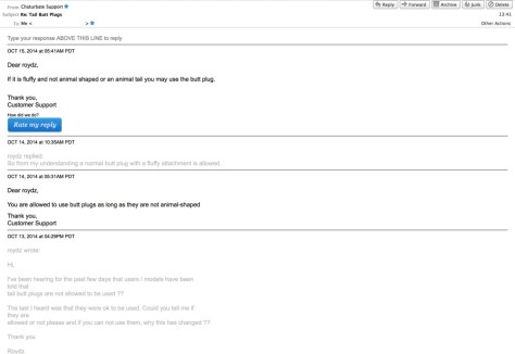 All Image October 15, 2014 CBRules Leave a comment Chaturbate Butt Plug UPDATE Butt Plugs are allowed, but if the butt plug is Animal shaped or has a tailed attached you are NOT allowed to use them. BUT a fluffy butt plug IS allowed. Share this: Click to share on X (Opens in new window) X Click to share on Facebook (Opens in new window) Facebook