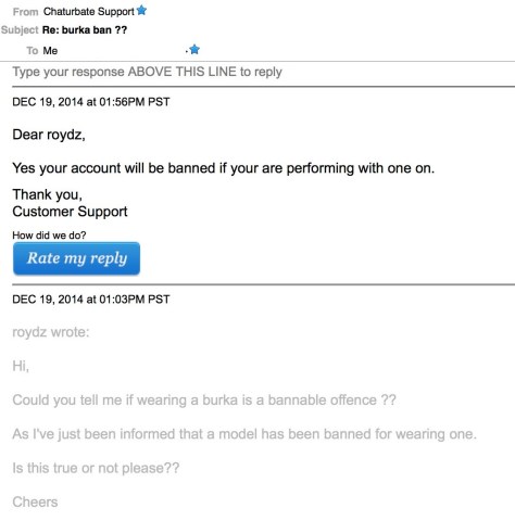 All Image December 19, 2014 CBRules Leave a comment Wearing the Burka while on webcam on the site is banned. Share this: Click to share on X (Opens in new window) X Click to share on Facebook (Opens in new window) Facebook