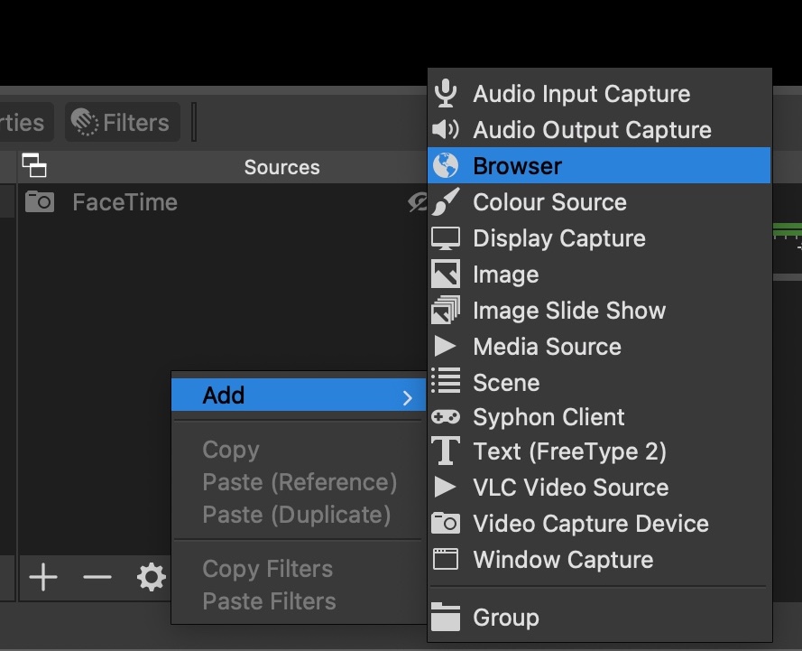 Now open OBS, in Sources right click & select ADD ->> Browser